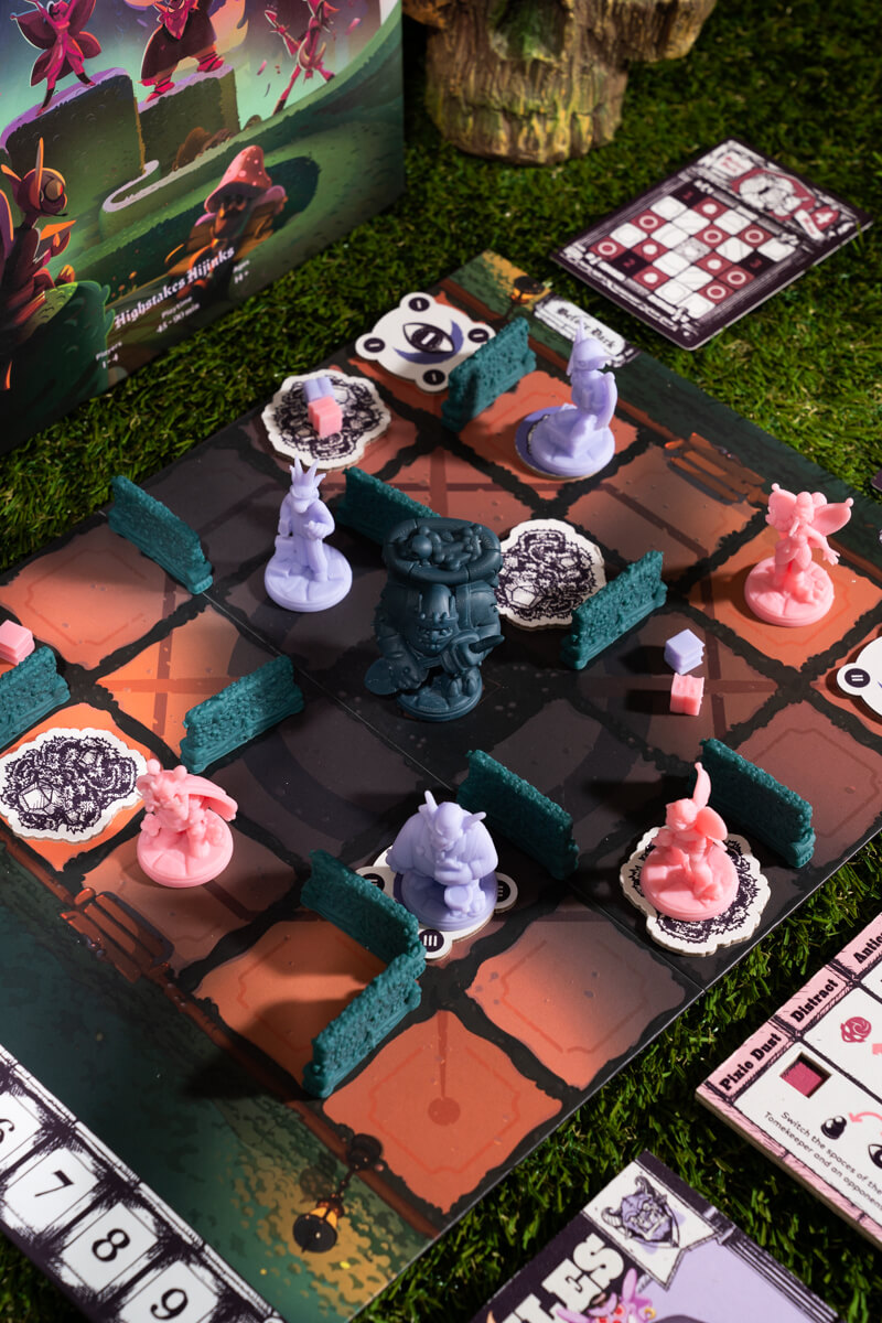 The groundskeeper moves at the end of every turn, heading towards their next destination token. Use your turn to move your opponents into the groundskeeper’s path—or move some hedge walls and change the path entirely!